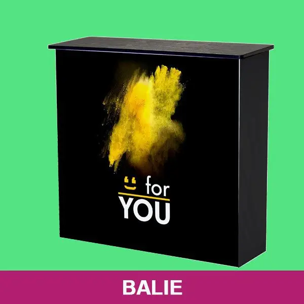 De balie bestaat uit een stabiel frame voorzien van een geprint dekostof doek. Met klittenband bevestig je het doek handig aan het frame. Heb je een andere beurs of alleen een balie nodig voor een presentatie dan bestel simpel losse doeken zodat je de balie eenvoudig voor meerdere beurzen en evenementen verandert.Eenvoudige montage zonder gereedschap